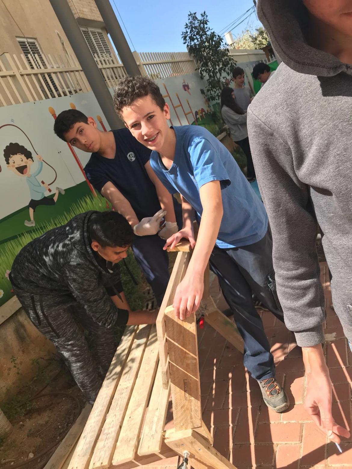 המתנ"ס הקהילתי החדש פועל להבנה ולשילוב צרכי הקהילה ומקדם הן פעילות התנדבותית והן פעילות בנושאי קיימות. בשיתוף עם עפרה גזית, רכזת המתנ"ס ותם שי, ממרכז הקיימות רחובות, זוהה הצורך בארגון מקום ישיבה ושיפוץ רחבת המתנ"ס לרווחת המבקרים בו. תלמידי הכיתה והמחנכת, שלי זאנה, הגיעו לשני ימי פעילות בנושא. לאחר הרצאה של תם בתחום, קיבלו הילדים משימת חקר המרחב, זיהוי צרכי הקהילה ובניית תוכניות עבודה מעשיות לפתרון. החלק השני בפרויקט היה מעשי ובו התלמידים בנו בפועל ספסלים, עמלו וקישטו לפי התוכניות הנבחרות לארגון חצר המתנ"ס. תם הוביל בהתנדבות את ההדרכות ואת הפרויקט. רשת חוויות והעירייה, באמצעות עפרה הרכזת ומ"מ מנכ"ל חוויות צביקה מדהלה, תמכו בקידום הפרויקט ואף תרמו את הציוד הנדרש. חומרי הגלם נאספו מהרחוב - חומרים ממוחזרים ברוח הקיימות ובהתאמה לשטח.