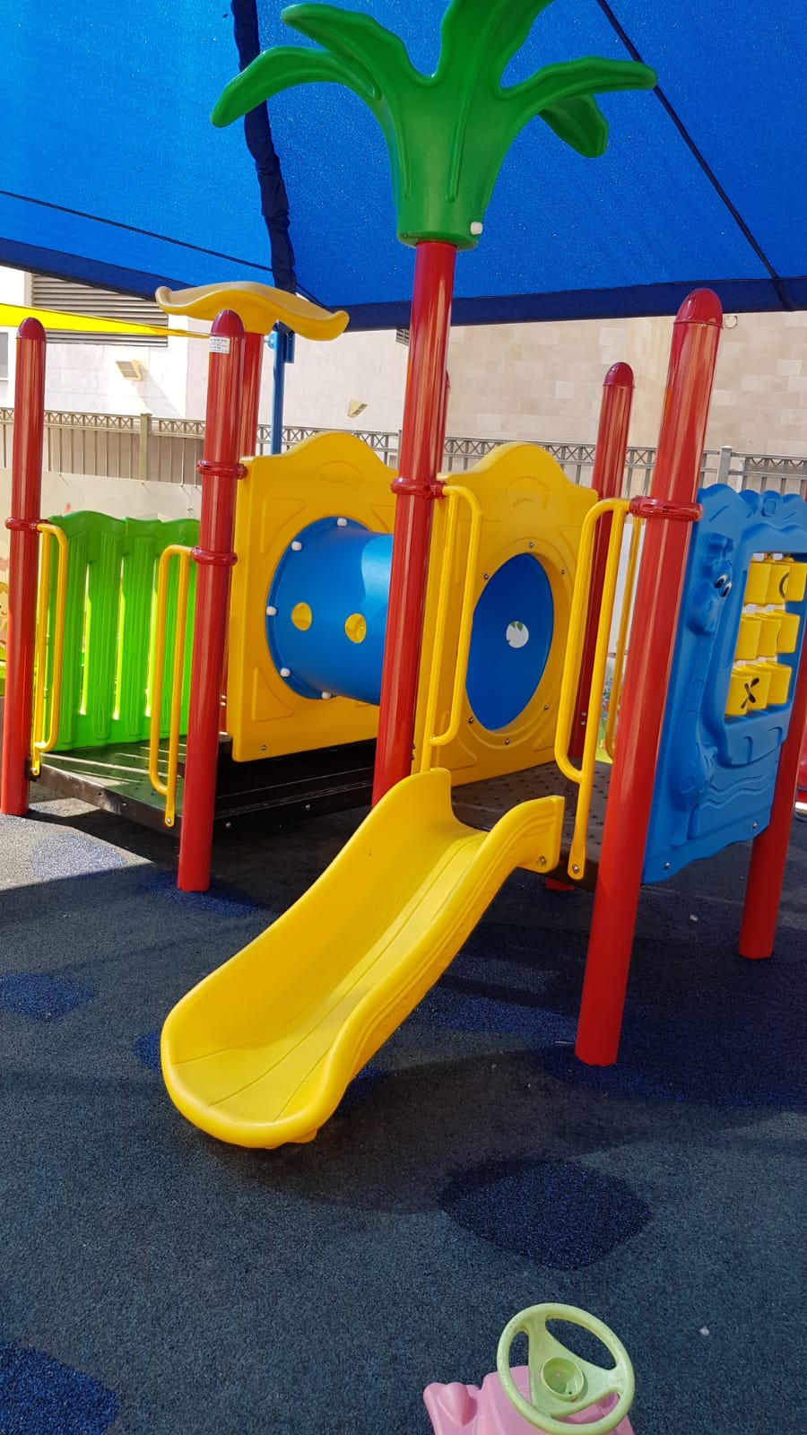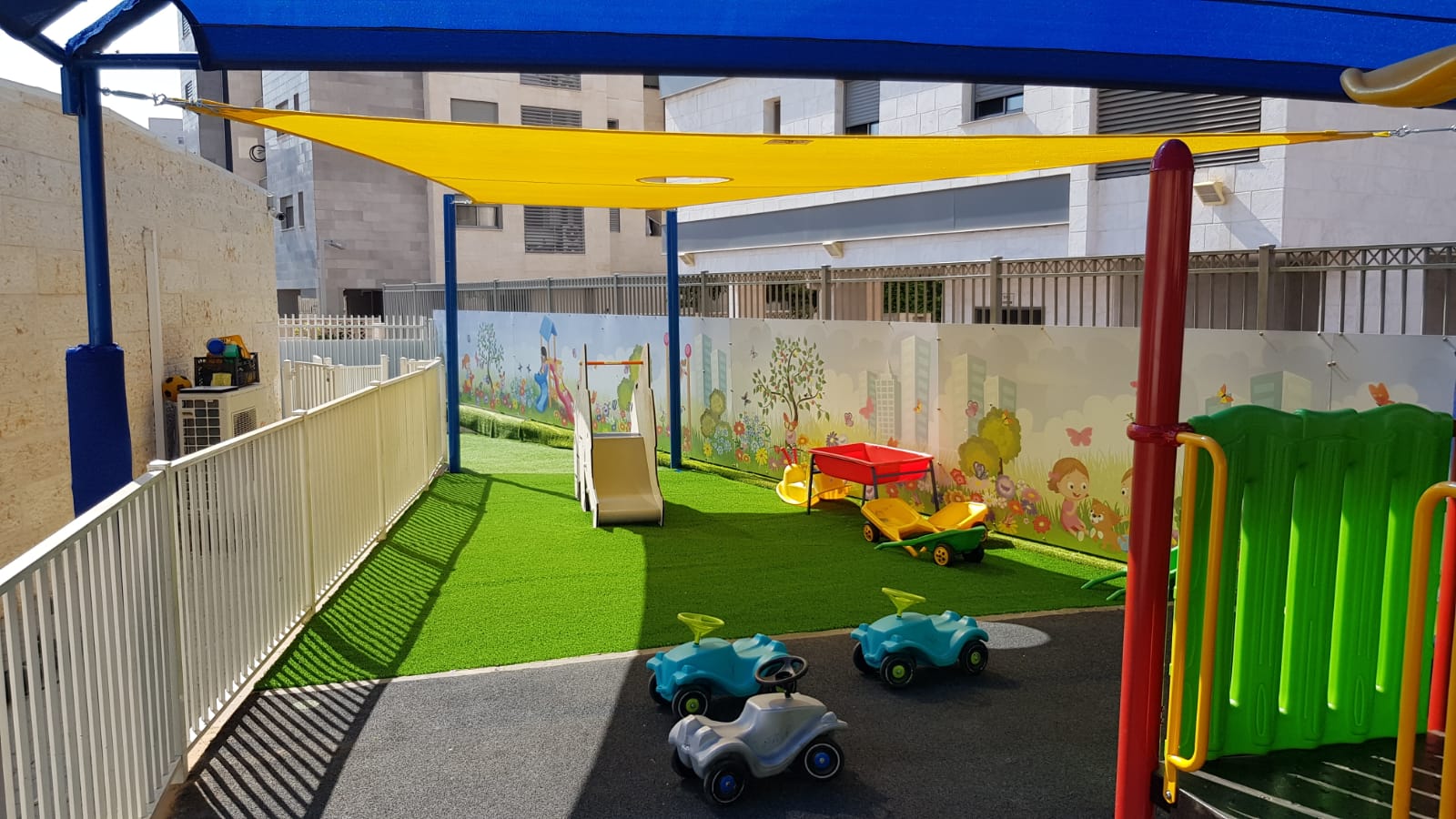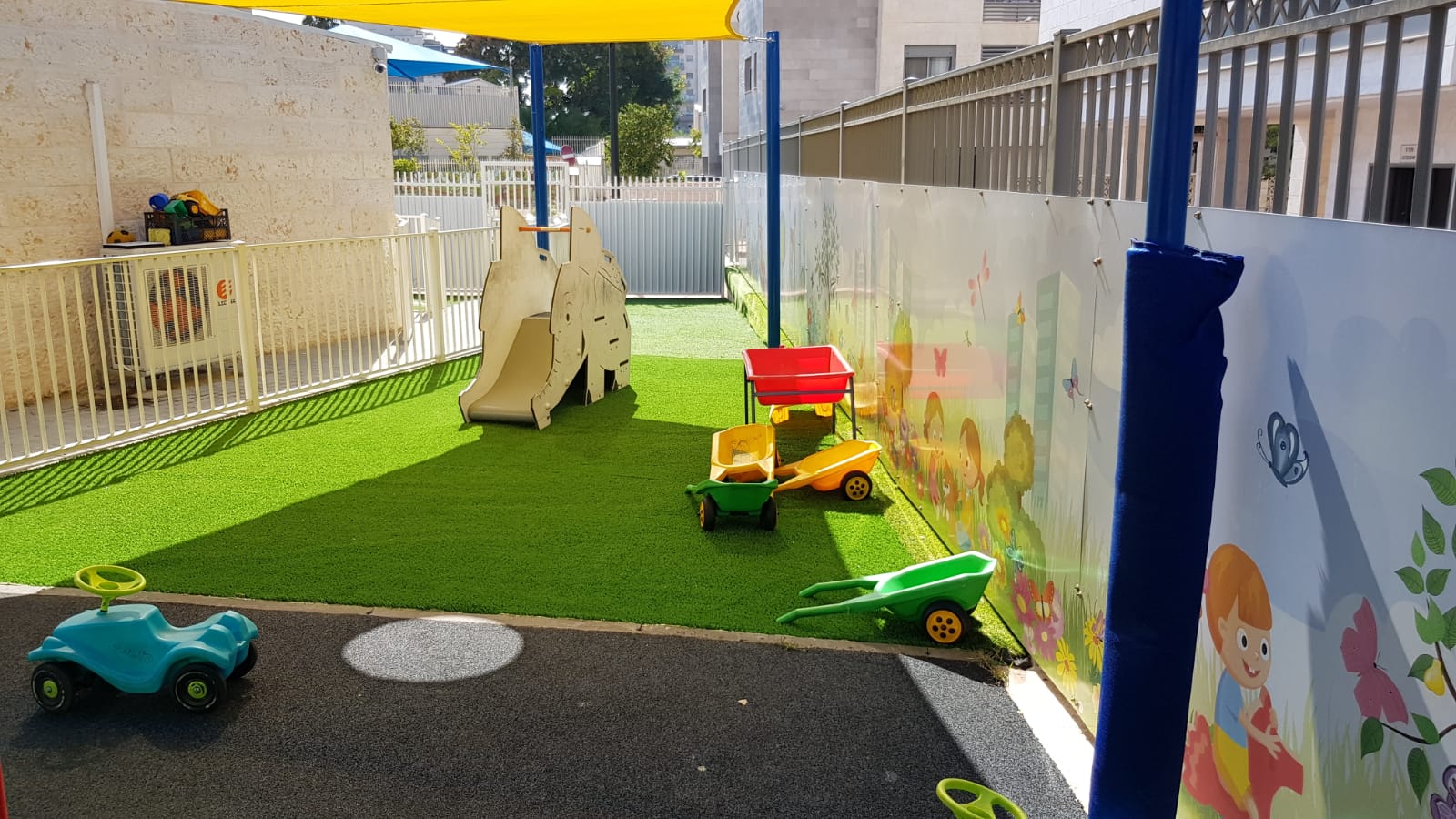עבודות השיפוץ כללו התקנת דשא סינטטי וריצוף גומי מותאם בכל שטח החצר, מתקני ילדים חדישים ומותאמי גיל וכן, הצללה של כל מתחם המשחקים.