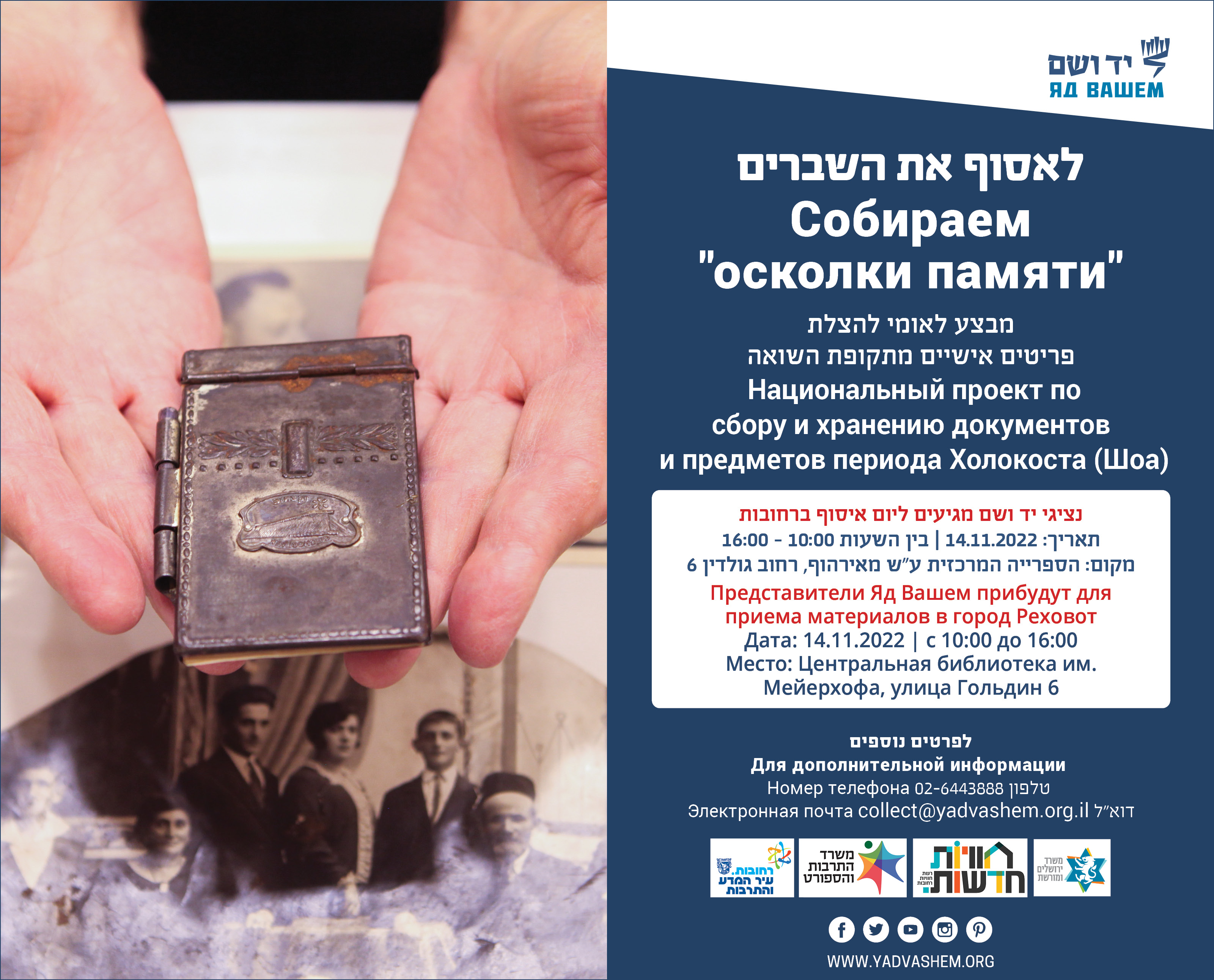 במסגרת הפרויקט "לאסוף את השברים", יוצא צוות מ"יד ושם" פעמים בשנה ברחבי הארץ לפגוש קהל של ניצולי שואה, דורות שני ושלישי המעוניינים למסור פריטים אישיים מתקופת השואה. השנה לראשונה החל שיתוף פעולה עם הספריות העירוניות ועד כה נערכו 12 ימי איסוף מרוכזים מנהריה ועד באר-שבע. ב"יד ושם" מדווחים כי בעקבות פניות רבות למבצע איסוף הגיעו מהעיר רחובות והסביבה ושיתוף פעולה עם רשת חוויות, הוחלט כי האיסוף הבא יתקיים בספרייה העירונית ביום שני הבא, 14.11.22.