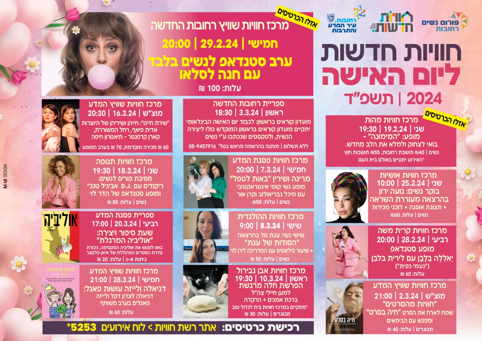 שני | 19.2.24 | 19:30 | נשים | ₪40 תושבת רחובות, ₪55 תושבות חוץ | *האירוע יתקיים באולם בית העם