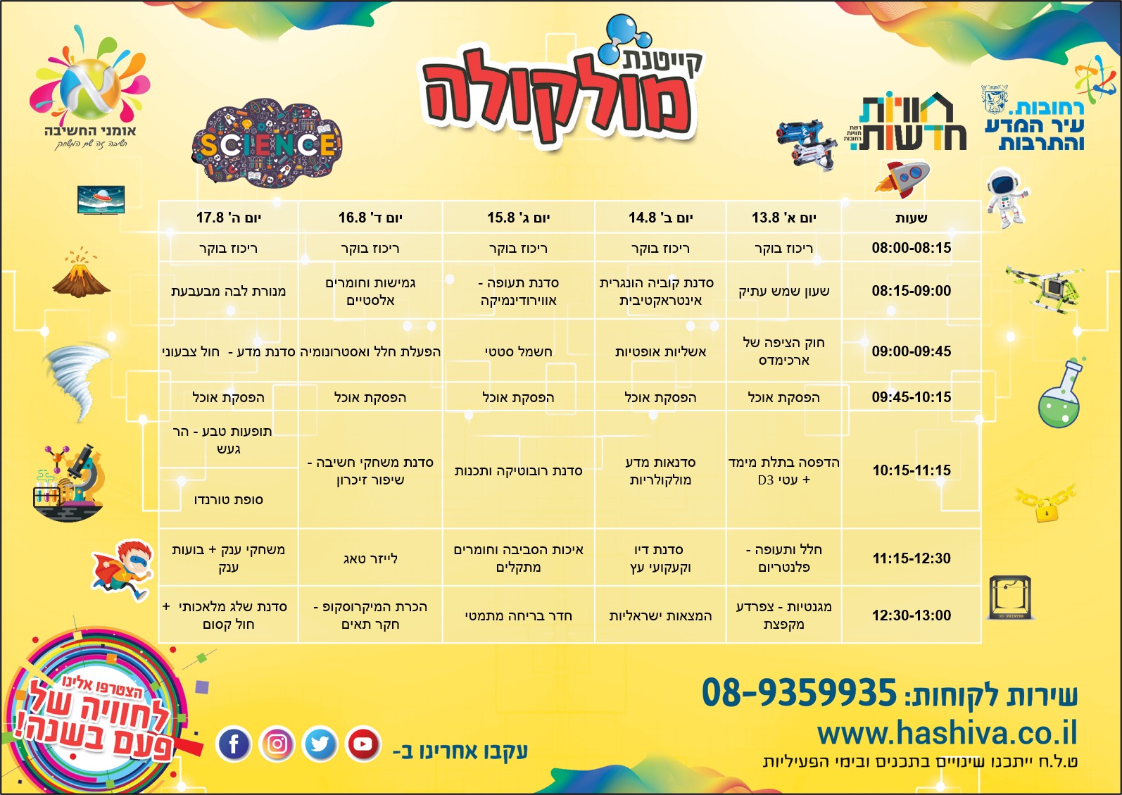 תאריכים הקייטנה: 13/8-17/8.23 | שעות פעילות: 8:00-13:00 | לגילאי א'-ו'